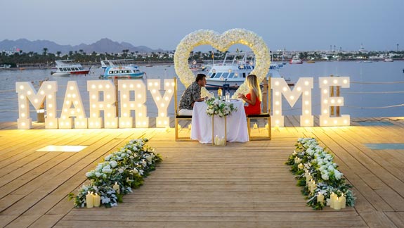 Excite your girlfriend and future wife with an unusual proposal. Many couples that have been in dating for a while, want one of the most important events in their relationship to leave bright, colourful memories, just like a real fairy tale. Surprise your better half with an original MARRY ME Proposal In Sharm El Sheikh. This lovely city, full of oriental charm, will be the perfect fit for your proposal!